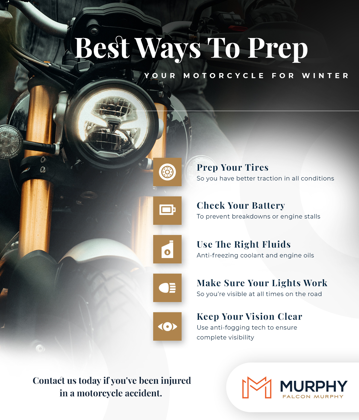 Stay safe on your motorcycle this winter with the help of these tips from Murphy, Falcon, & Murphy. If you or a loved one have sustained injuries from a motorcycle accident, call us today to get started with a consultation about your case.