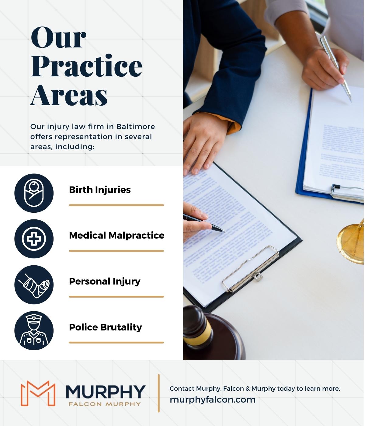 At Murphy, Falcon & Murphy (MFM), our injury law firm in Baltimore focuses on several practice areas, all with the expertise of lawyers who know how to approach each case with professionalism and compassion. We want to represent you and ensure that your rights are upheld, regardless of your circumstances. For more than 70 years, the MFM name has stood for aggressive legal advocacy and a commitment to fighting for justice in every case. When results matter, our personal injury attorneys are the ones to call.