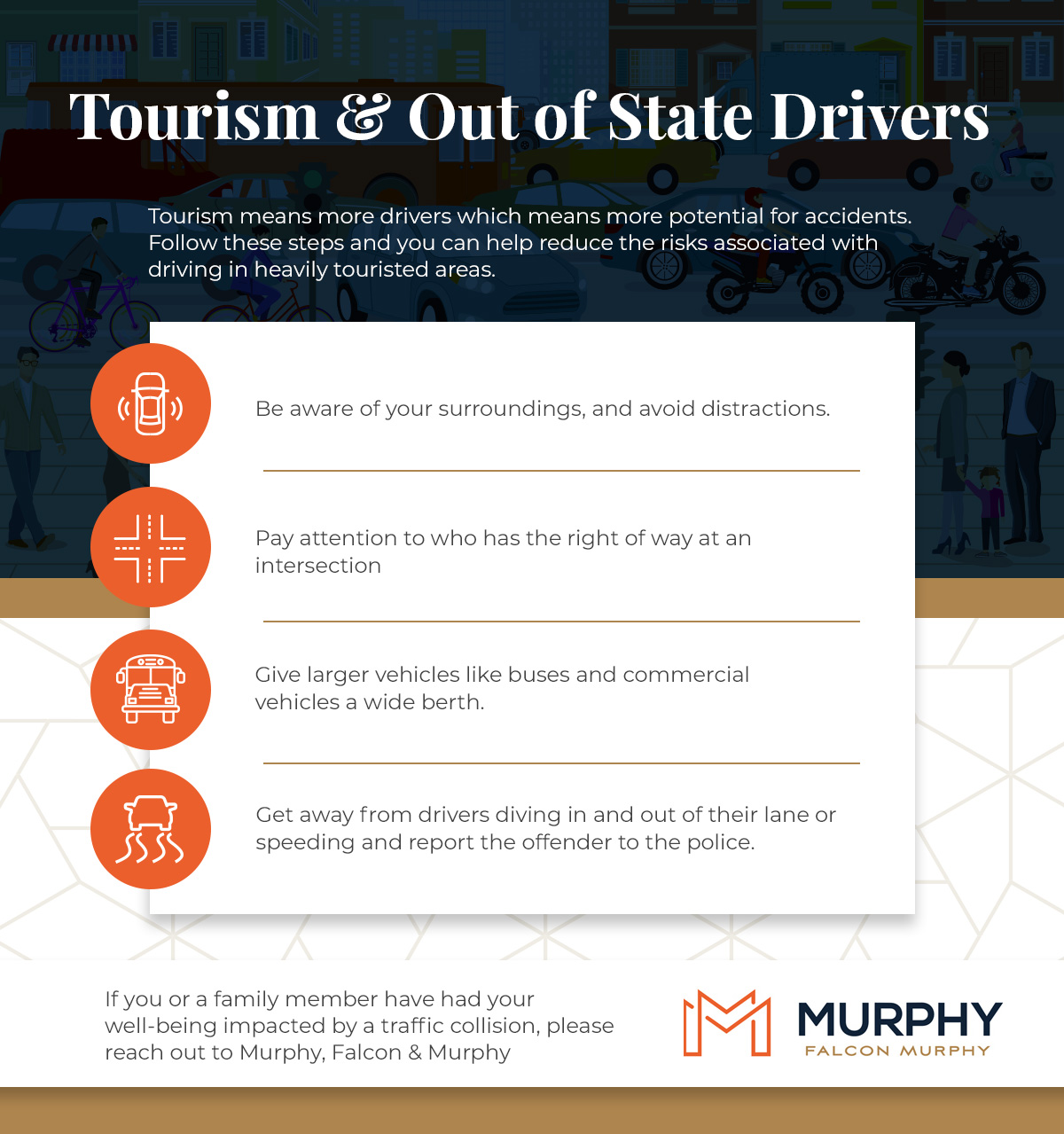 This is before taking into consideration that tourists will be driving on unfamiliar roads with potentially unfamiliar driving patterns of locals, and all of this on top of trying to make sure that their vacation schedule is on track. They may be looking at their GPS more, driving a rental vehicle that they’re not quite used to, looking up addresses, talking to their families, missing turns, driving into dead ends, or down one-way roads. Mistakes are bound to happen with these overwhelming distractions, especially with the quantity of tourism that’s attracted to the area.