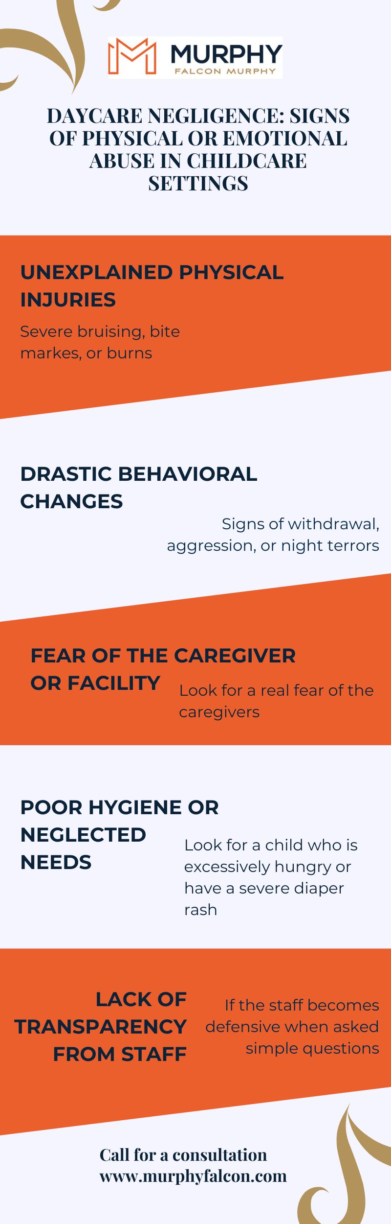Here are five critical signs that your child may be experiencing physical or emotional abuse in a childcare setting. Schedule a consultation today.