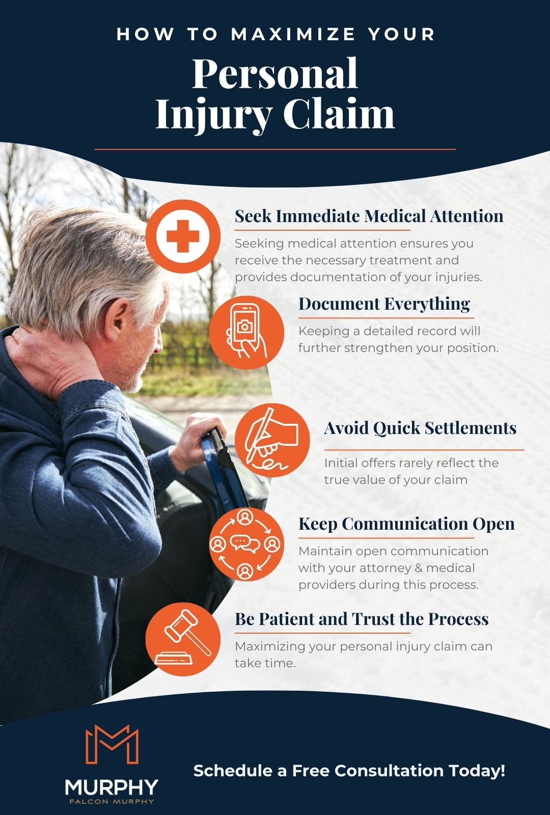 Navigating the aftermath of an accident can be overwhelming, especially when dealing with injuries and mounting bills. At Murphy, Falcon & Murphy, a renowned personal injury law firm in Baltimore, we understand the importance of maximizing your personal injury claim. Here are five essential steps to ensure you receive the compensation you deserve. Schedule a consultation today.