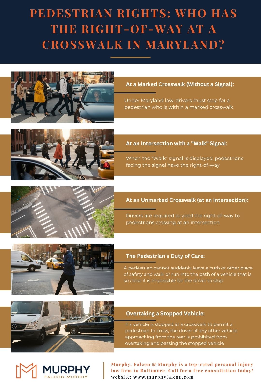 Walking in a busy city like Baltimore should not feel like a life-threatening activity, yet pedestrian accidents remain a serious and far too common danger. At Murphy, Falcon & Murphy, a leading Maryland personal injury law firm, we see the devastating consequences when drivers fail to respect the rights of those on foot. Understanding Maryland’s right-of-way laws is the first step in protecting yourself and knowing your rights if the worst happens. Here’s what you need to know about who has the right-of-way in Maryland. Schedule a consultation today.